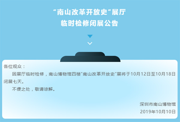 近日,深圳南山博物館發布通告,因展廳臨時檢修,南山博物館四樓“南山改革開放史”展將于10月12日至10月18日閉展七天。